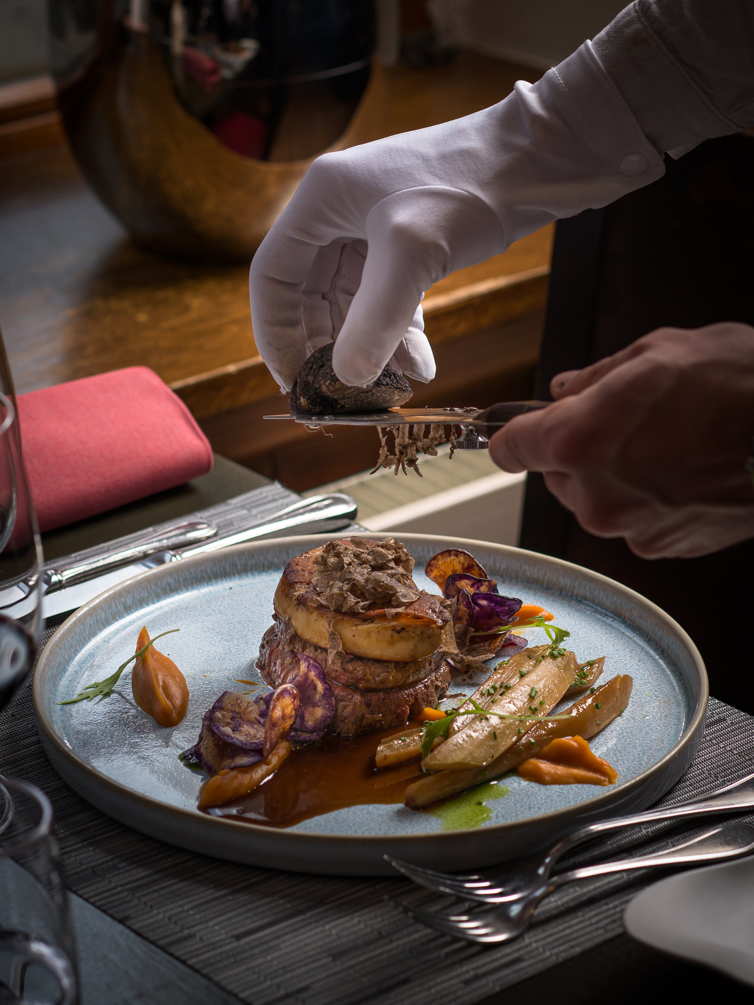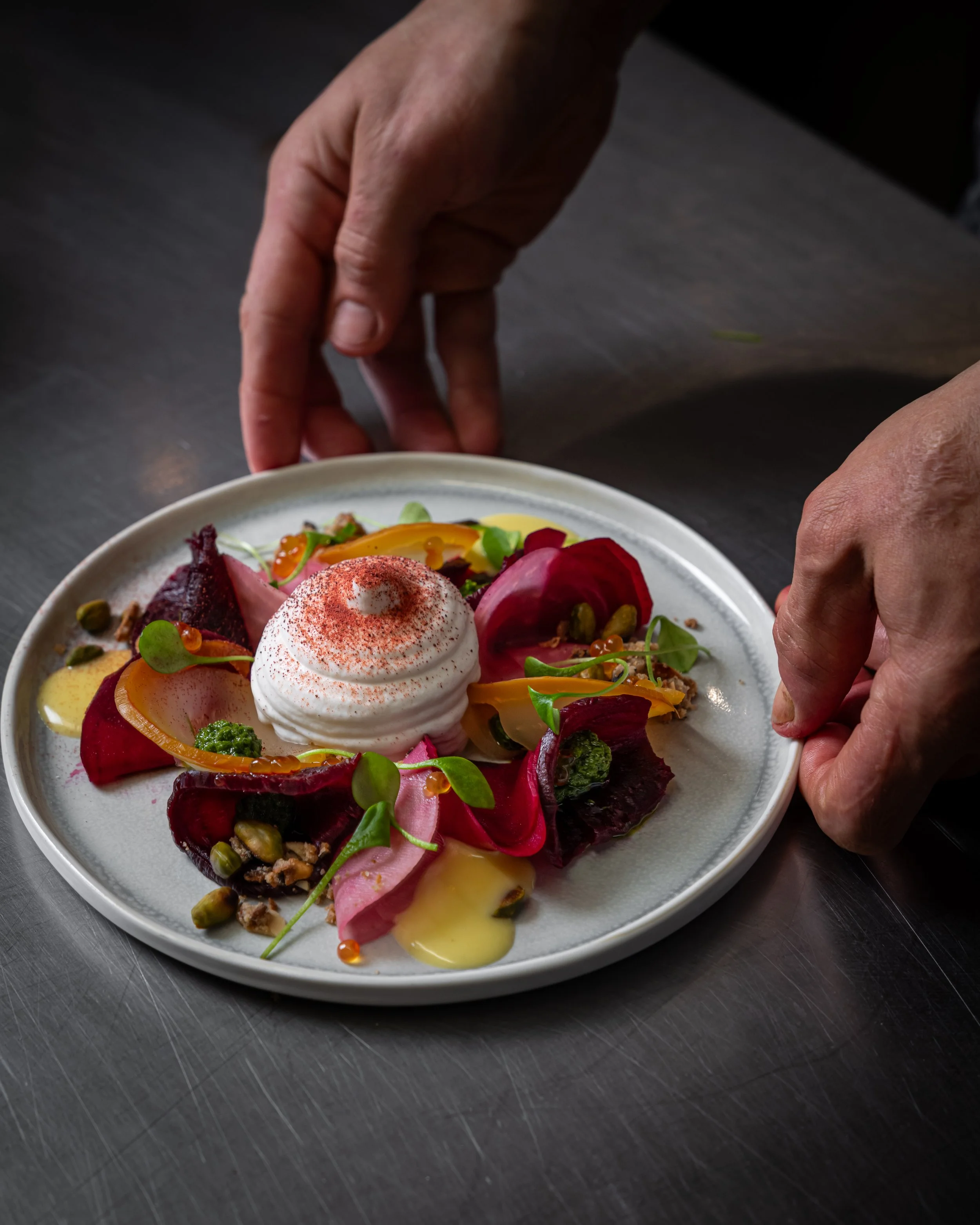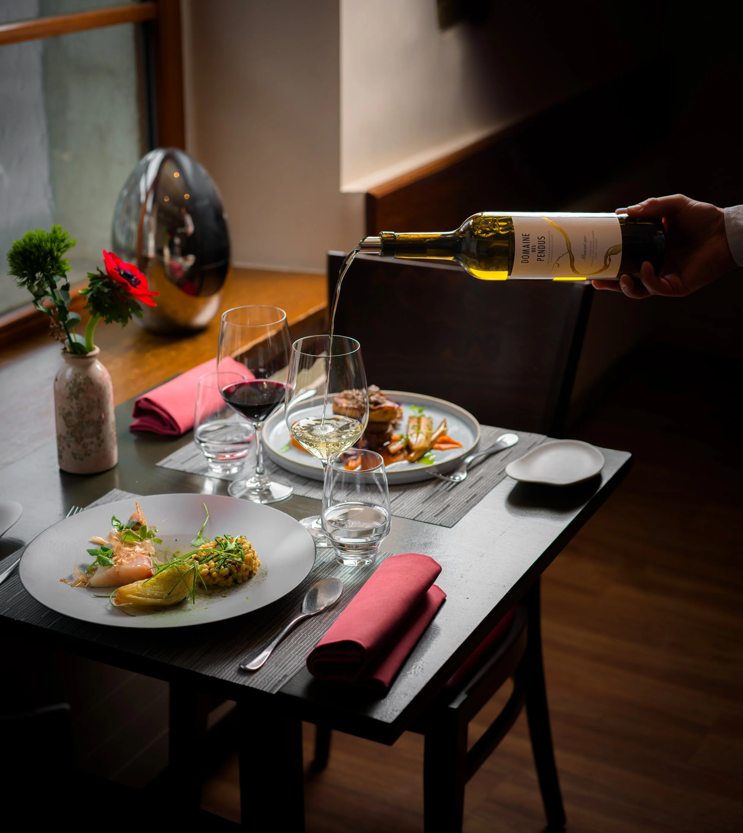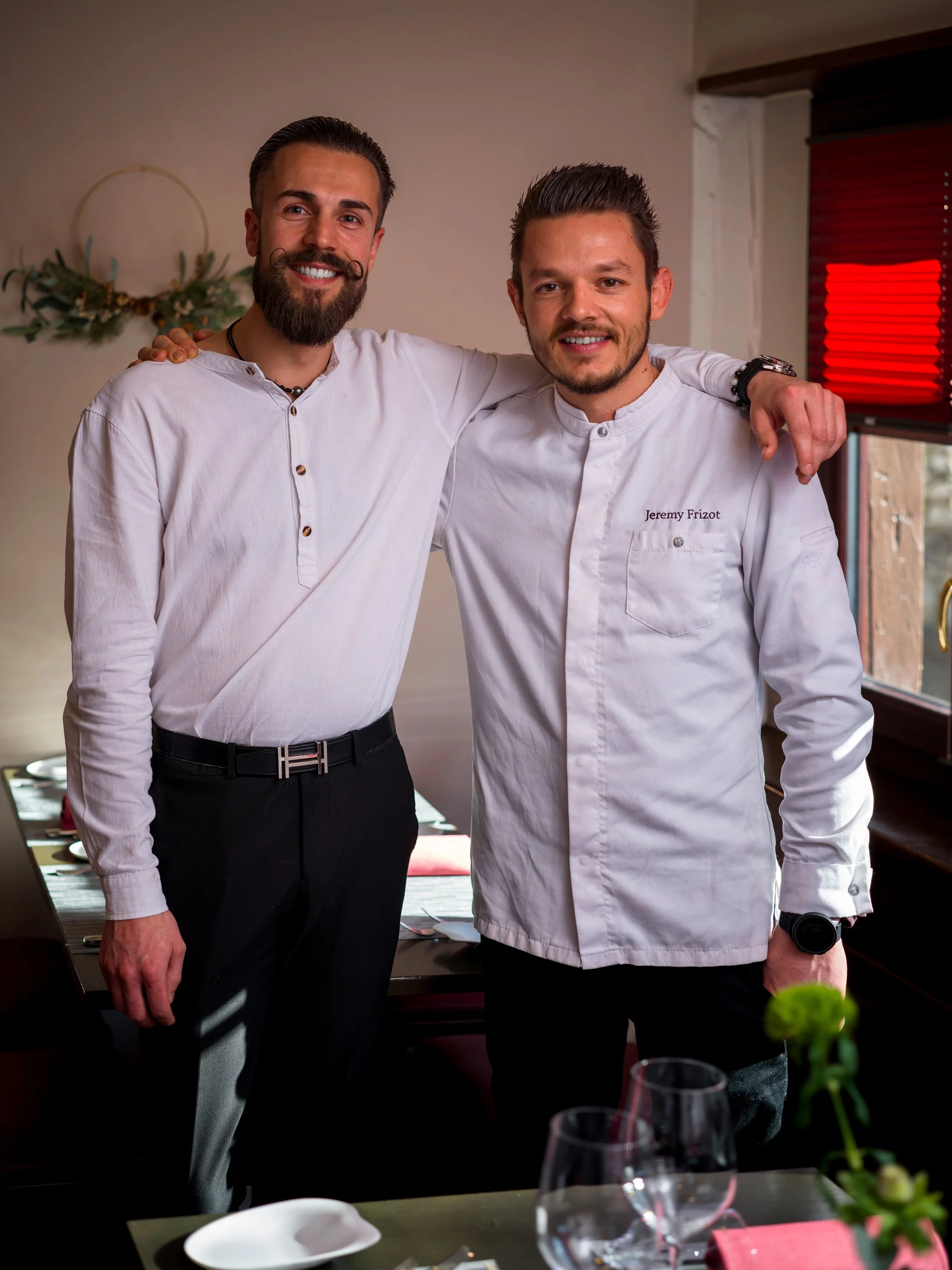 En cuisine, Jeremy Frizot imagine au fil des saisons une cuisine gastronomique moderne, ancrée dans le terroir genevois et les produits de Veyrier. Entouré de sa brigade, il compose des menus pensés comme des voyages, où technique, créativité et respect du produit se rencontrent.